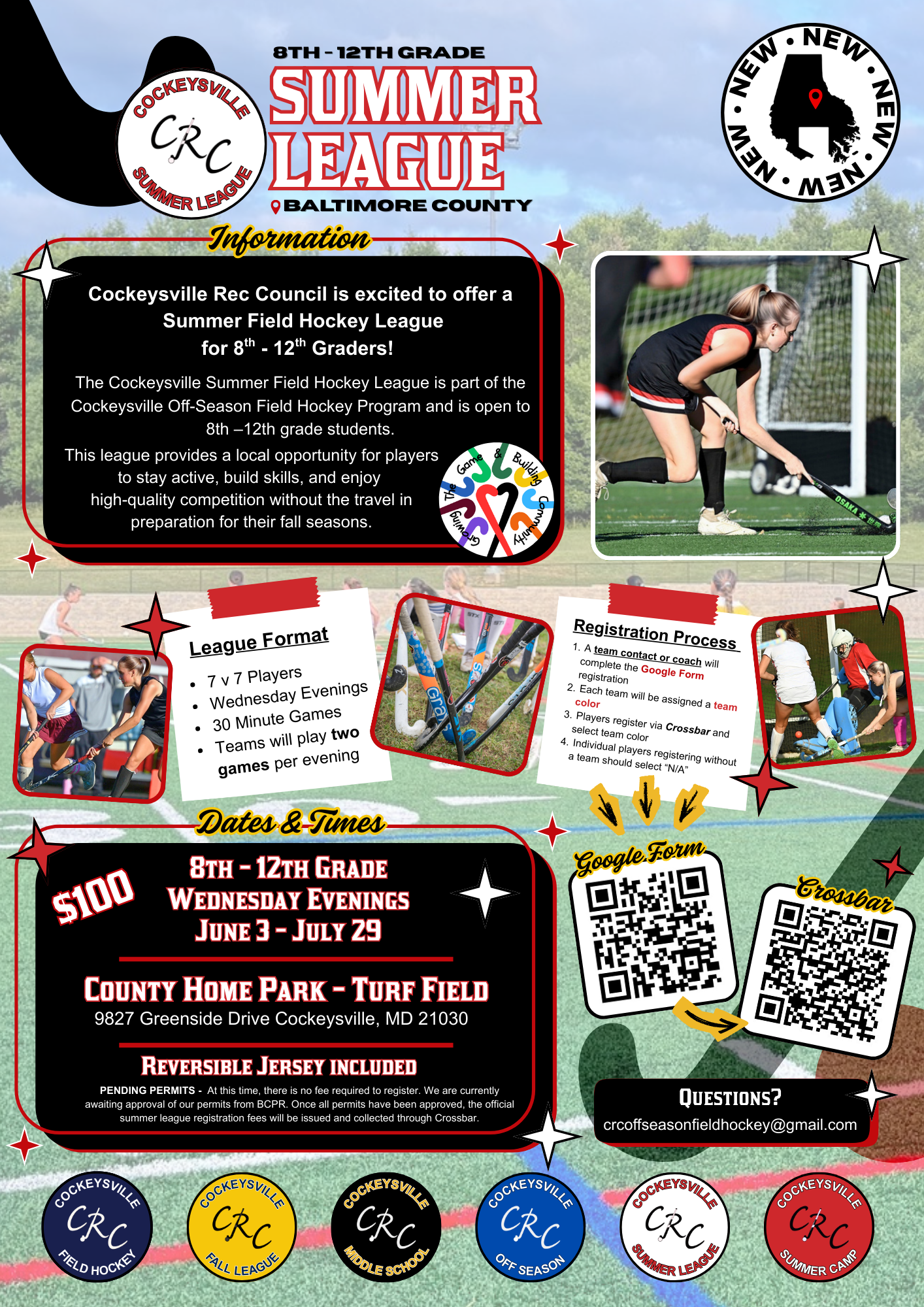 NEW: The Cockeysville Summer Field Hockey League is part of the Cockeysville Off-Season Field Hockey Program and is open to 8th–12th grade students.