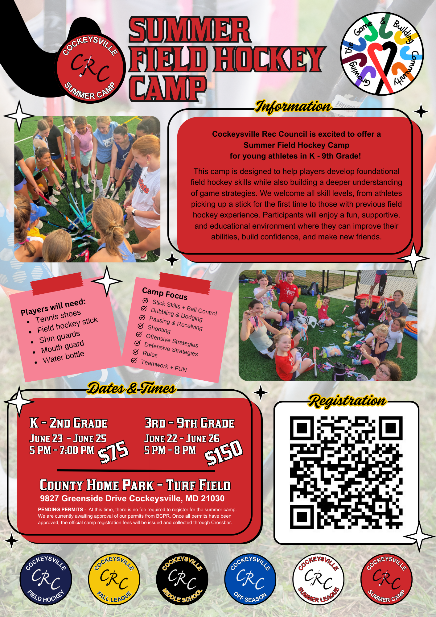 Cockeysville Rec Council is excited to offer a Summer Field Hockey Camp for young athletes in Kindergarten - 9th Grade! This camp is designed to help players develop foundational field hockey skills while also building a deeper understanding of game strategies. We welcome all skill levels, from athletes picking up a stick for the first time to those with previous field hockey experience. Participants will enjoy a fun, supportive, and educational environment where they can improve their abilities, build confidence, and make new friends.